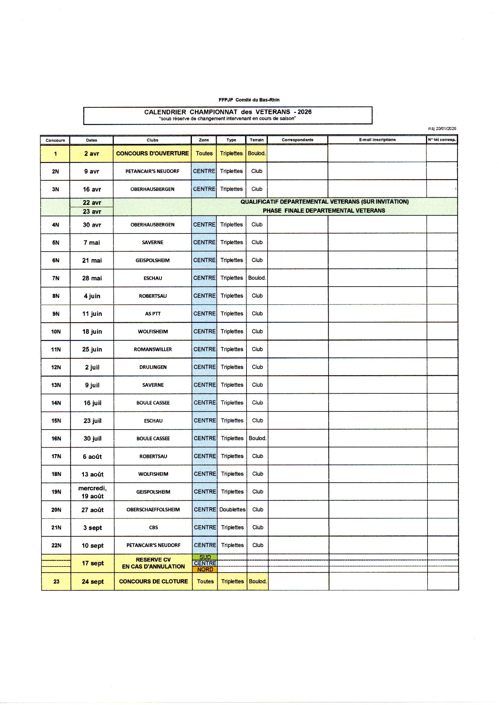 Calendrier Vétérans 2026